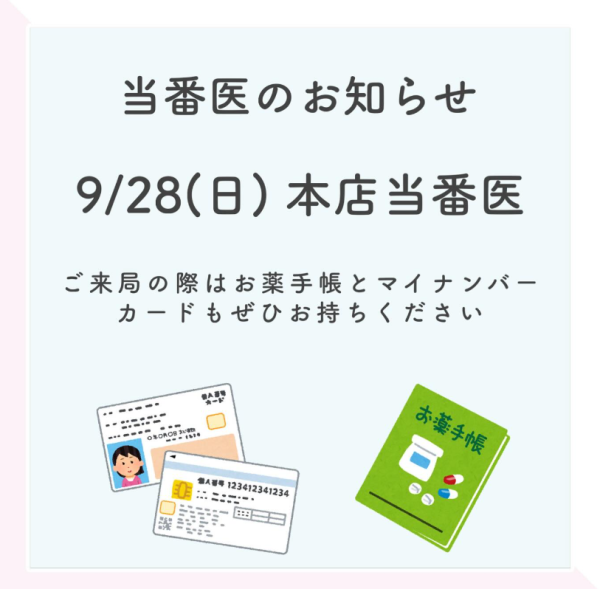 9月28日(日)当番医のお知らせ 2025.09.28 お知らせ おはようございます☀️富士薬局です🫧本日の当番医についてお知らせいたします。〜2025年9月28日(日)〜日曜日は、富士薬局 本店:群馬県太田市八幡町12-7当番医のため開いています🥼お越しの際は、マイナンバーカードやお持ちであればお薬手帳をご持参ください☁️ < >