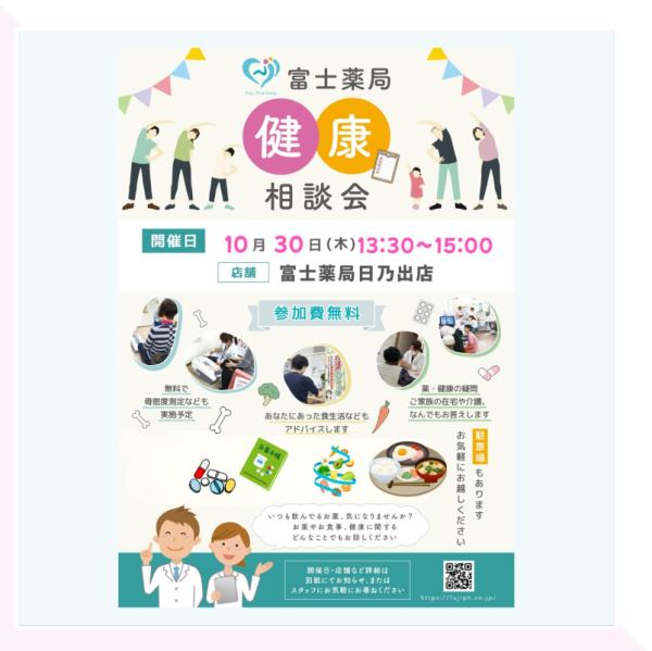 健康相談会を開催🦴 2025.10.29 管理栄養士 明日10月30日(木)13:30〜15:00富士薬局日乃出店にて健康相談会を開催します🙌🏻管理栄養士と薬剤師が食事に関する栄養相談やお薬などに関しての相談を行います。無料で骨密度測定もできます🦴どなたでもご参加いただけますので是非足を運んでみてくださいね😌💭 < >